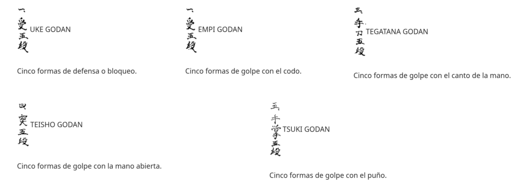 Los katas básicos son cinco y son muy simples en su ejecución. Están constituidos por cinco tiempos, y sus desplazamientos están limitados a un paso al frente; un paso atrás o, un paso en diagonal. Una vez que se han ejecutado los cinco tiempos por el lado derecho, se vuelve a la posición Heiko-dachi (con los pies paralelos), y se repiten los mismos movimientos por el lado izquierdo, volviendo luego hacia atrás, a la posición de saludo, Musubi-dachi (con los pies unidos por los talones y las puntas en 45 grados). Los katas deben ser totalmente simétricos, y siempre deben volver al mismo punto en donde partieron.